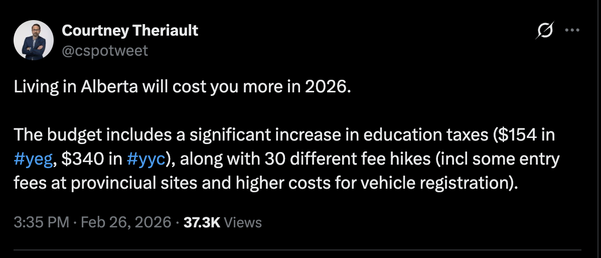 Alberta Municipalities (ABmunis) was sharper in tone, warning that while the province says it is not raising taxes, Budget 2026 effectively shifts costs onto property taxpayers.